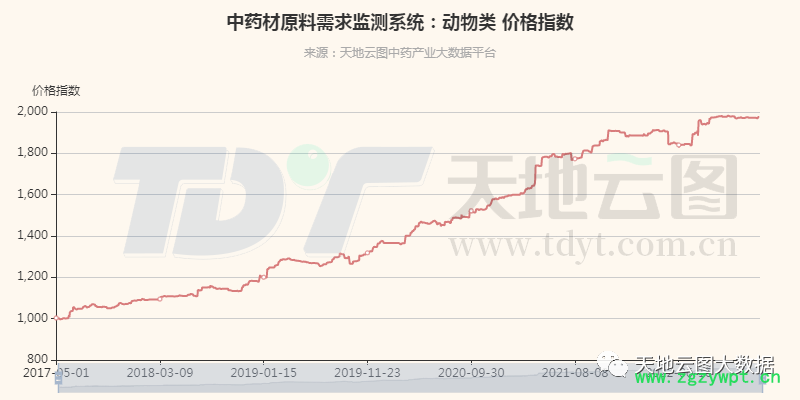 从价格指数波动看:动物类中药材价格指数稳步攀升。由于动物类药材具有独特的疗效,在中医用药中不可或缺。随着全民健康的普及以及健康意识的提升,民众对动物类中药材原料的需求也在快速攀升,推动该品类行情不断走高。动物类价格指数从2017年最低的996.12上涨至2022年的1981.83,涨幅98.95%。