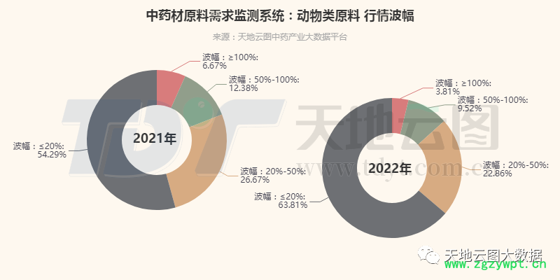 从行情波动看:2022年,价格波动大的动物类中药材品种数比2021年减少。2022年,动物类中药材价格波动幅度超过100%的有4个,占比较2021年下降2.86%;价格波动幅度在50%-100%的有10个,占比较2021年下降2.86%;价格波动幅度在20%-50%的有24个,与2021年相比下降3.81%;价格波动幅度≤20%的有67个,占比较2021年增加9.52%。