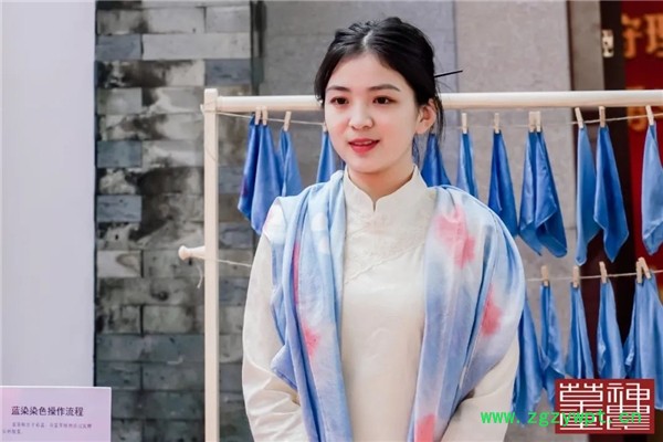 讲解员展示板蓝根扎染围巾