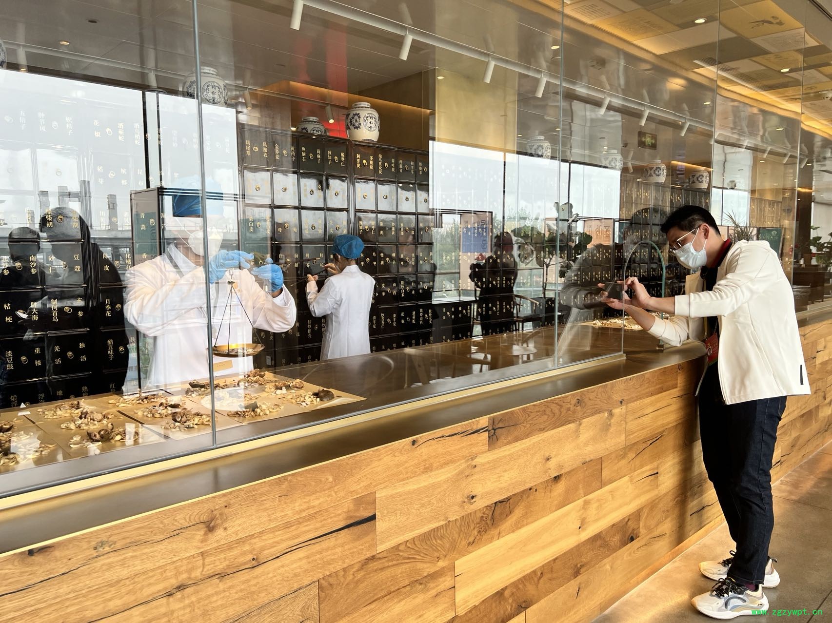 同仁堂知嘛健康零号店内的中药调剂台前,泰国媒体记者郑权之为正在称重的工作人员拍照。 新京报记者 秦胜南 摄