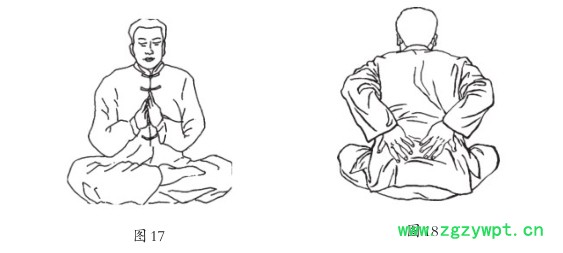 动作1(图17):取坐姿,不拘盘腿、垂腿。以鼻缓缓纳入清气。闭气,搓手急数令热极。鼻中徐徐放气出。