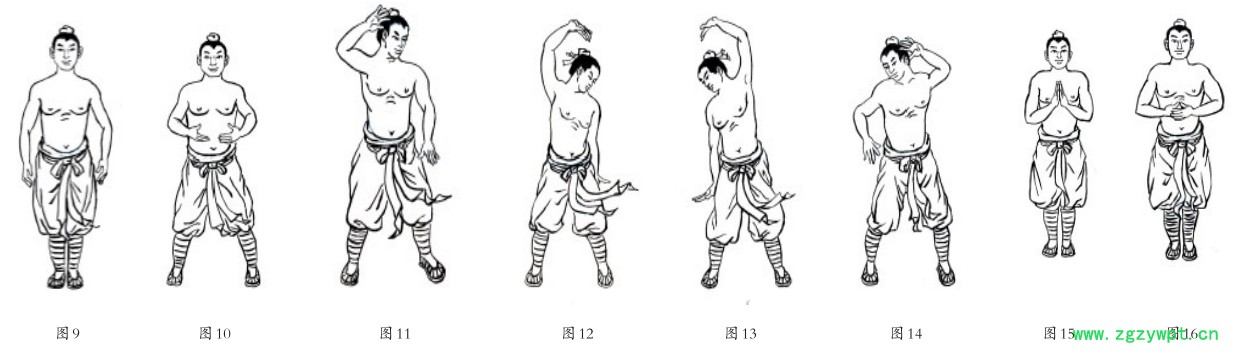 动作8(图16):气息调匀后恢复至松静站立。