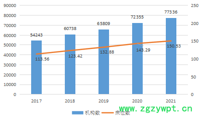 我国中医药服务能力也随之不断增强,相关医疗卫生机构数量持续增长。据资料显示,2021年我国中医类医疗卫生机构数量达77,336个,床位数达150.53百万张。从结构分布来看,中医类诊所为67,743个,占比为87.6%;中医类医院为5,715个,占比为7.39%;中医类门诊部为3,840个,占比为4.97%;中医类研究机构为38个,占比为0.05%。