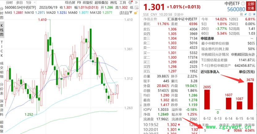 主流 ETF 方面,截至 10:20,中药 ETF(560080)涨 1.01%,成交额超 8700 万元。值得注意的是,上交所数据显示,近日中药 ETF(560080)频频获资金净流入,6 月 16 日最新单日资金净流入超 3600 万元,近 5 日净流入额超 9000 万元!