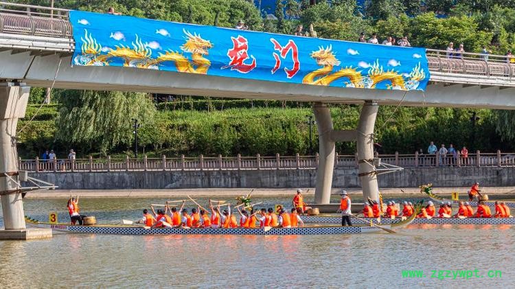 6月13日,龙舟队在河南省三门峡市青龙涧河文博城附近水域开展水上训练。新华社发(杨启帆 摄)