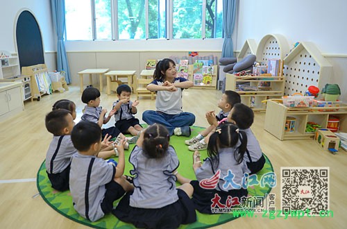 6月20日,位于南昌市青山湖区的长天小红星智慧托育中心,老师正在与小朋友一起做游戏。(图片均匀江西日报全媒体记者 张翰林摄)