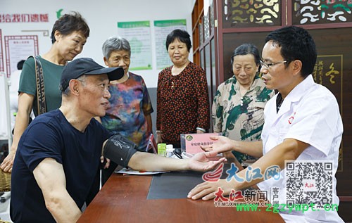 6月16日,宜春市袁州区下浦街道东湖社区家庭健康服务中心,家庭健康指导员正在为辖区老年人测量血压。