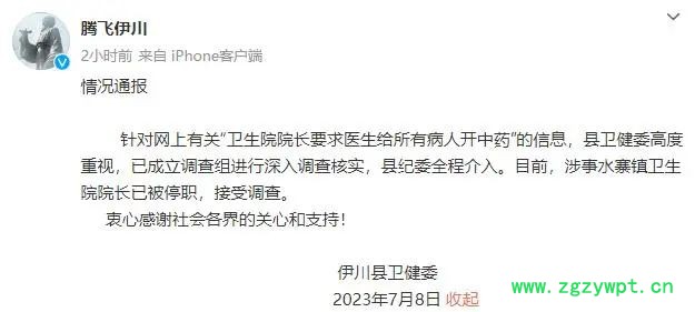 7月8日,河南洛阳伊川县卫健委通报,针对网上有关“卫生院院长要求医生给所有病人开中药”的信息,县卫健委高度重视,已成立调查组进行深入调查核实,县纪委全程介入。目前,涉事水寨镇卫生院院长已被停职,接受调查。