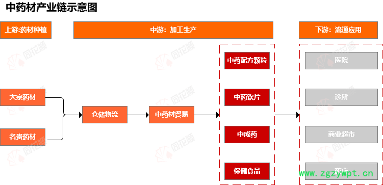 从产业链上游来看,中药材主要分三大类:药用植物,是指医学上用于防病、治病的植物;药用动物,凡具有一定的入药或能医治人、动物或植物的动物都可列入药用动物。药用矿物是指经传统加工炮制作为药材、使用于传统医药的单矿物或矿物集合体,如石膏、方解石或高岭土乃至琥珀、石燕化石等;还有不少人工制品。