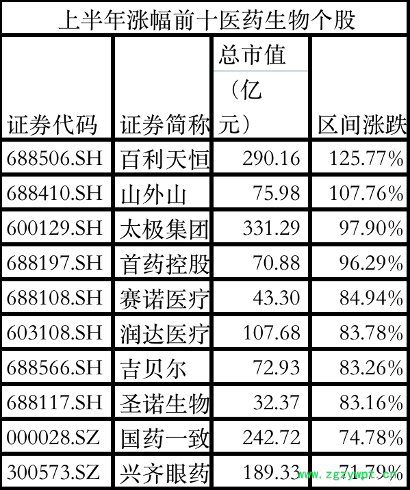 上半年,医药企业股价仍未见起色。8家千亿市值医药企业中,仅恒瑞医药上涨24.76%。不过,医药生物板块不乏领跑者,百利天恒、山外山、太极集团、首药控股等企业股价涨幅超90%,百利天恒涨超125%。
