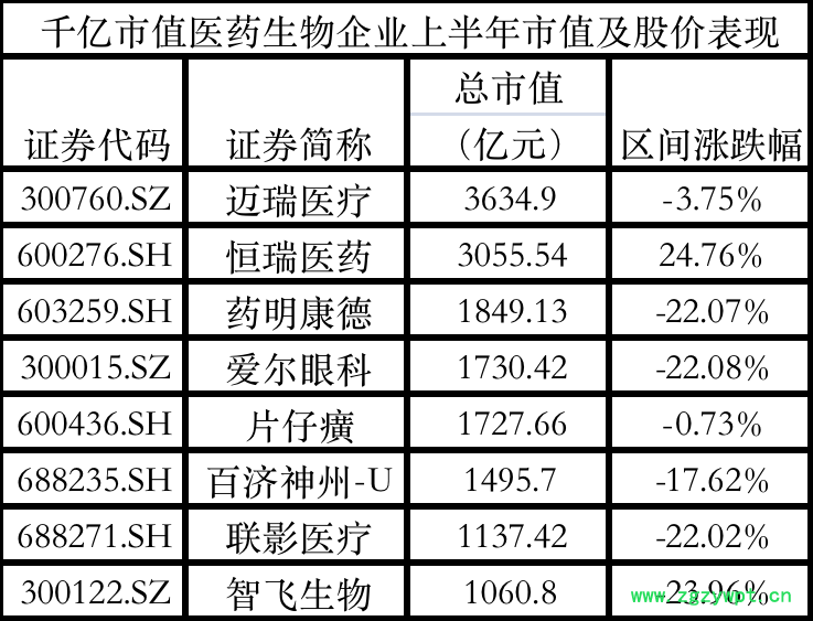 8家千亿市值企业中,仅恒瑞医药上半年涨幅为24.76%,其余7家企业上半年区间涨跌幅均为负值。