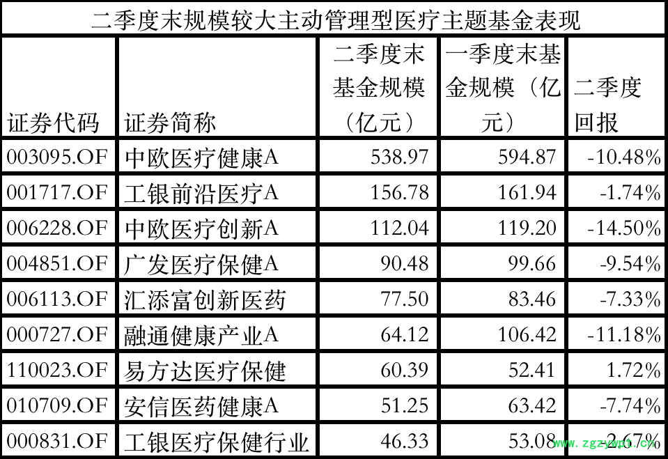 贝壳财经记者梳理看到,上半年医药板块整体表现平平,二季度主动管理型医疗主题基金普遍出现规模缩小。其中,葛兰管理的中欧医疗健康基金二季度末规模为538.97亿元,较一季度末缩水超50亿元。