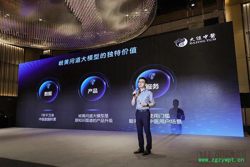 王祺表示 " 岐黄问道 · 大模型 " 差异化的独特价值分别是数据、产品和服务(图片来自大经中医)