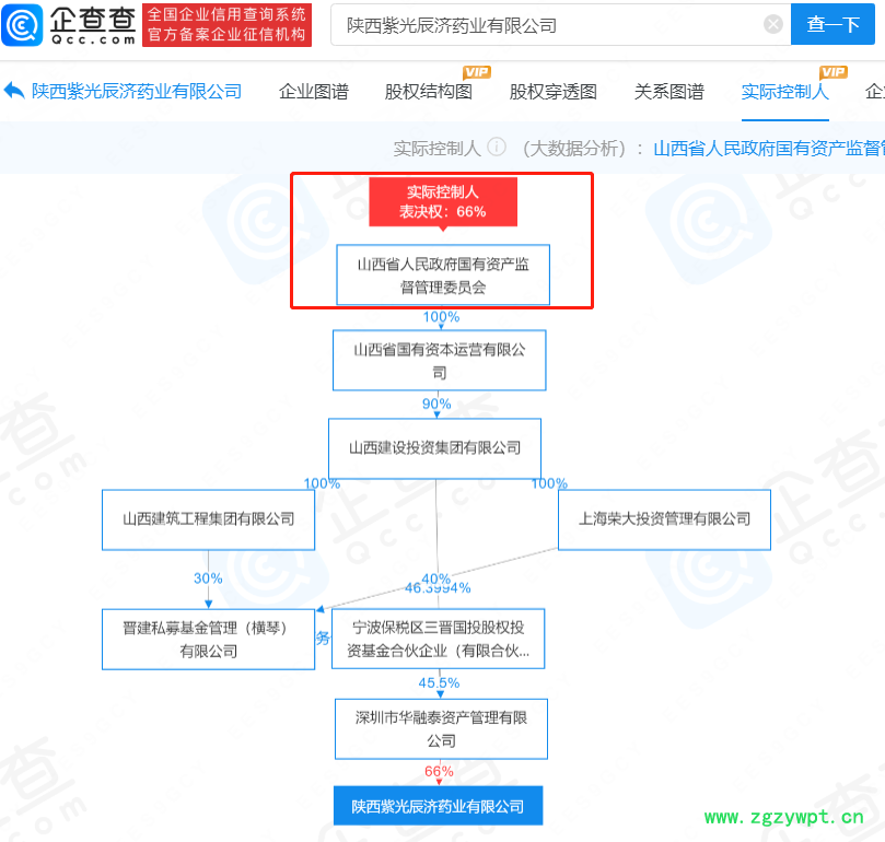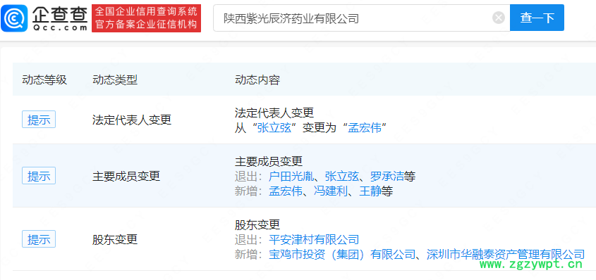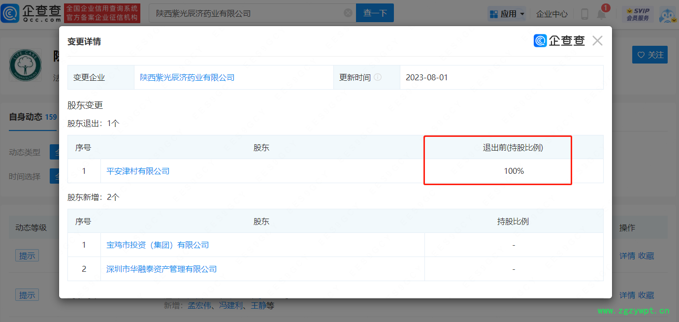 企查查APP显示,近日,百年老字号中药企业——陕西紫光辰济药业有限公司发生工商变更,平安津村有限公司退出该公司股东行列,股东新增宝鸡市投资(集团)有限公司、深圳市华融泰资产管理有限公司,两者分别持股34%、66%。此外,公司董事长由户田光胤变更为孟宏伟。企查查股权穿透显示,变更后的紫光辰济药业,实控人为山西省国资委。