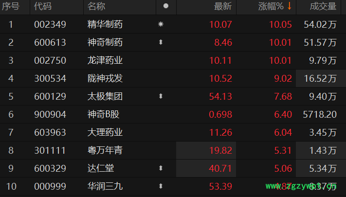 上证报中国证券网讯 8月8日,中药板块快速走高,截至10时54分,龙津药业、精华制药、神奇制药涨停,太极集团、达仁堂等跟涨。