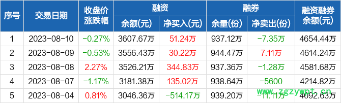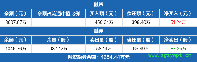 融资方面,当日融资买入450.64万元,融资偿还399.4万元,融资净买入51.24万元,连续4日净买入累计561.31万元。融券方面,融券卖出58.14万份,融券偿还65.49万份,融券余量937.12万份,融券余额1046.76万元。融资融券余额合计4654.44万元。