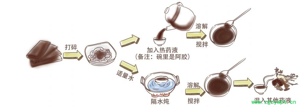 ▲ 烊化:是指将药物直接用煎好的药液溶化后服用,或另放入容器内加少量水隔水炖化,再兑入其他药物同服。某些胶质和黏性大的药材(如阿胶等)需要烊化。