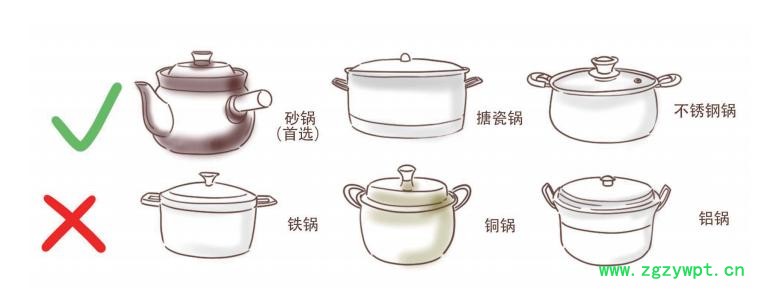 首选砂锅,其化学性质稳定,导热均匀缓和,不易与药物发生化学反应。也可选用搪瓷锅、不锈钢锅或玻璃器皿。忌用铁、铝、铜等金属器皿,因为金属元素容易与中药里的成分发生化学反应,使疗效降低,甚至产生毒副作用。