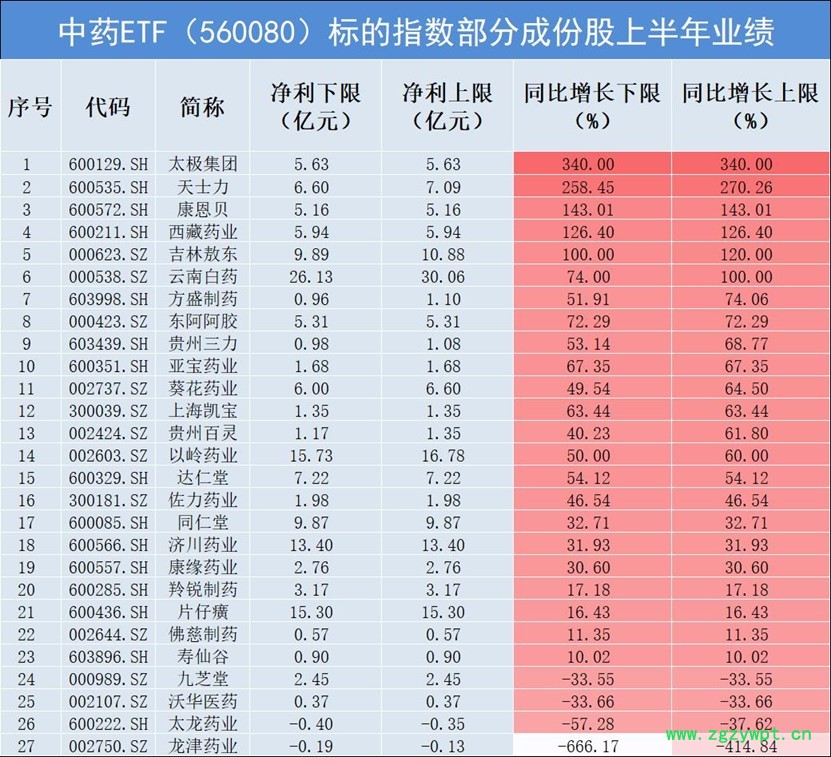 截至8月14日,中药ETF(560080)的标的指数成份股中,已有27家上市公司发布了半年度业绩预告获快报。太极集团以实现净利润归母净利润5.63亿元,同步增长340%,位列首位。天士力预计净利润约6.6亿元~7.09亿元,归母净利预增262%-274%;康恩贝、西藏药业、吉林敖东实现100%以上增速;云南白药、东阿阿胶、上海凯宝、亚宝药业、方盛制药等也都实现上半年净利大幅增长!以下为截至8月14日已发布的业绩情况,板块业绩整体高增!