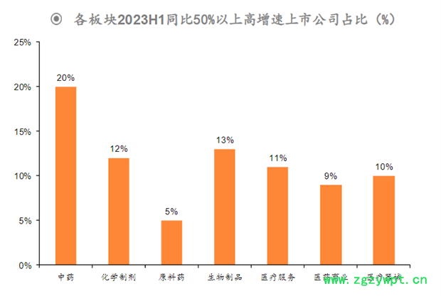 据平安证券统计,中药板块50%以上高增速公司占比20%位居行业景气度首位。从预告50%以上(包含上限达到50%)增速的公司数量及占比来看,中药行业预增50%及以上的公司数量达到14家,占该行业公司总数72家的20%,行业景气度最高。(来源:平安证券《医药板块2023H1业绩预告汇总:板块分化显著,中药板块整体业绩亮眼》)