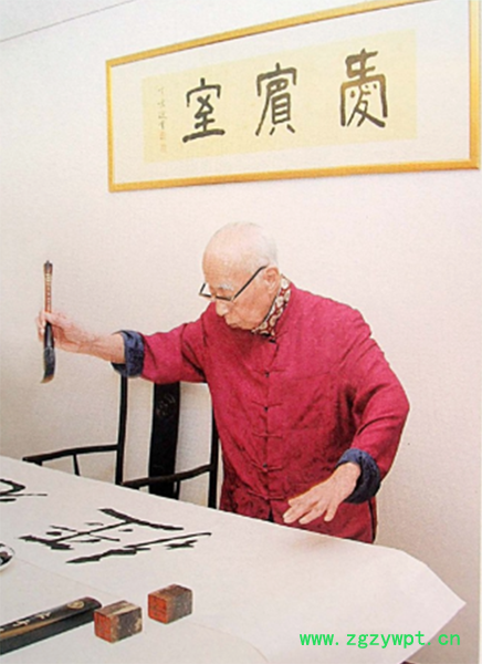 2008年饶宗颐在其书斋书写“大爱无疆”,赈灾义卖。