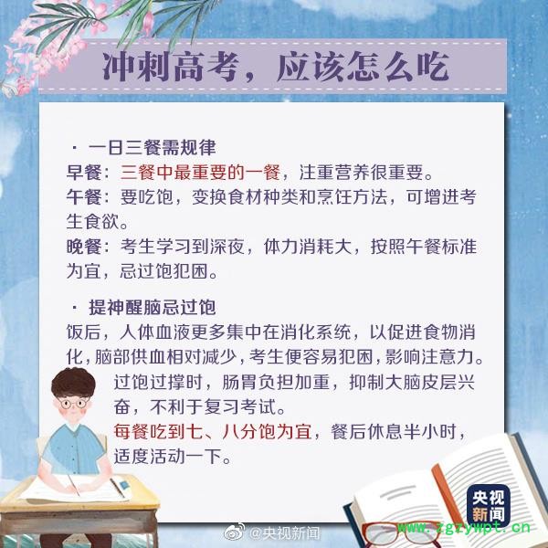 3天后就是高 考的日子,1291万名学子即将踏上考场。临近大考,睡不好觉怎么办?冲刺高 考,怎么吃才营养又健康?收好这份考前心态调整攻略↓↓祝福每一位考生,加油!