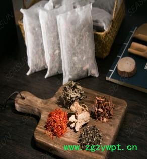 3.中药包:将配置好的药材放入香囊袋,收紧袋口,悬挂于床头、门把手或衣橱等地方,利用药材的香气起到驱蚊解暑等作用