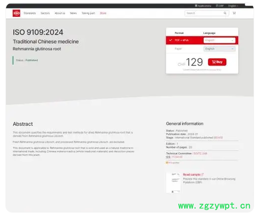 2024年1月,《中医药—地黄》国际标准(ISO 9109: 2024 Traditional Chinese medicine—Rehmannia glutinosa root)由国际标准化组织(ISO)正式发布,这是由上海中医药大学、河南中医药大学及仲景宛西制药联合完成的《中医药-地黄》国际标准,也是地黄第一个国际标准,具有非常重大的意义。
