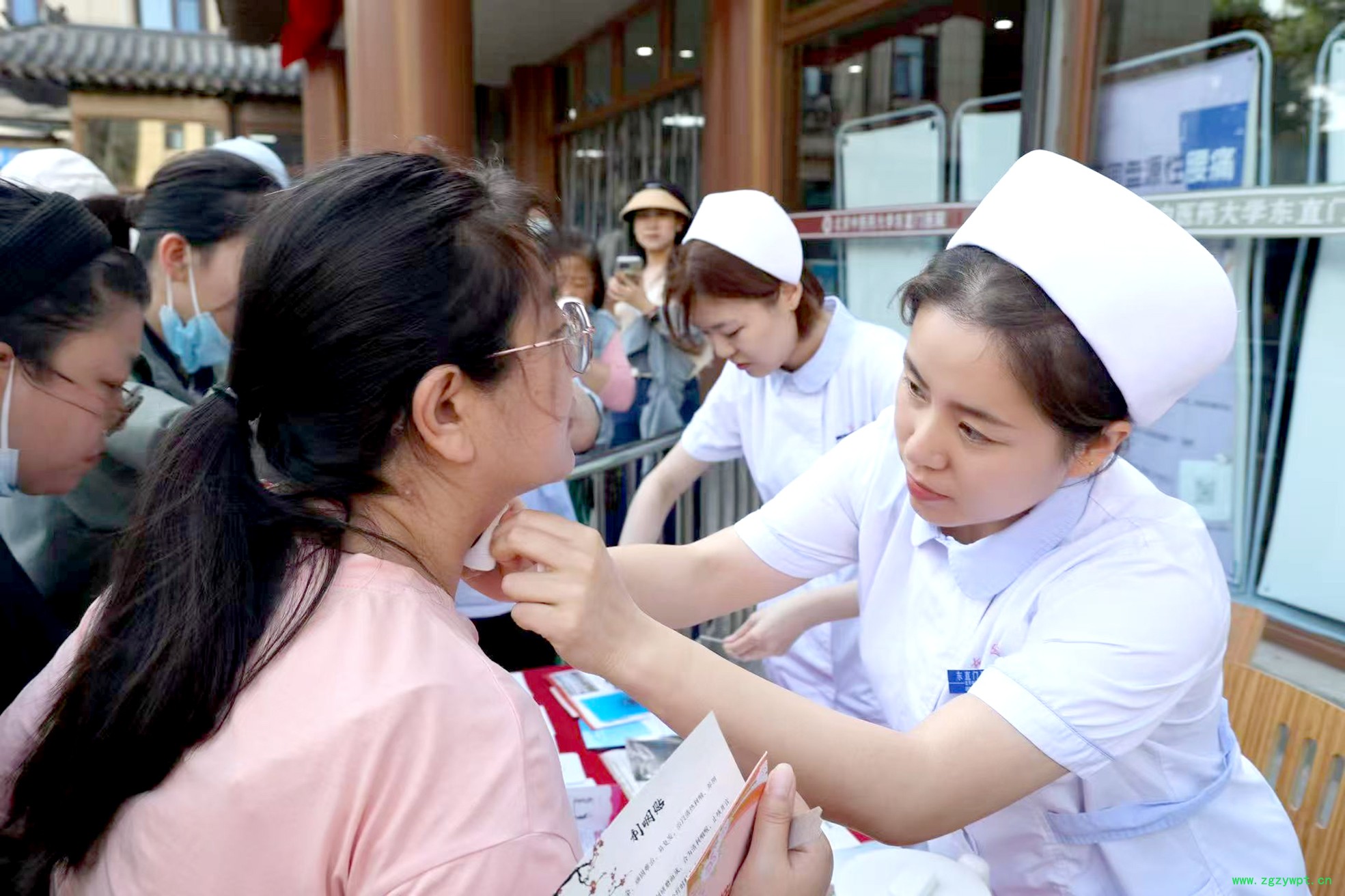 医护人员为群众贴可以治疗咽痛咽痒的咽贴。 刘文静王璐摄