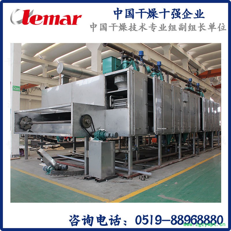 活性碳因颗粒小,易飘浮,要求高温干燥等的技术难点,一直以来没有合适的干燥器进行干燥,我司技术部针对这一技术空白,独自研制开发了活性碳带式干燥设备,解决了网带漏料,物料飞浮等难点,我公司设计制作的带式干燥设备采用13段干燥段气流下循环方式的设计,旋转铺料架自动铺料,增加冷却段。产量可达2吨/小时。