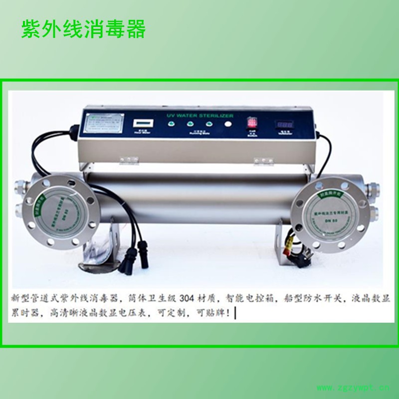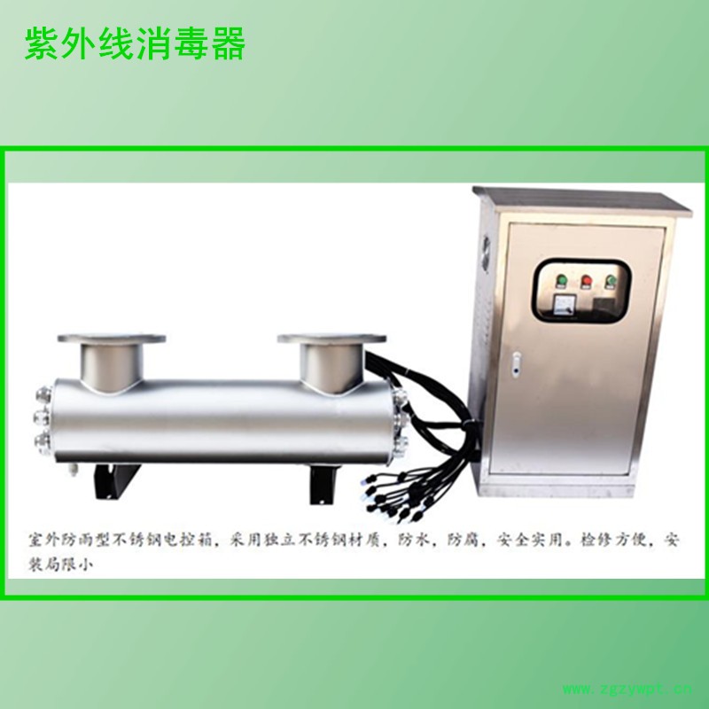 紫外线消毒设备即为利用高强度的紫外线杀菌灯照射,破坏细菌和病毒的DNA等内部结构,从而达到杀灭水中病原微生物的消毒装置。适合于对紫外线技术破坏力敏感的细菌、病毒、真菌等微生物种群谱系。