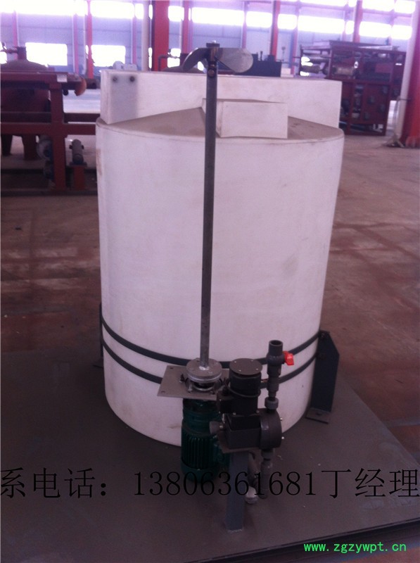 1、搅拌机:由搅槽机和搅拌装置组成。其作用是使需投加的溶质和水(溶剂)按一定比例配置后,使其充分混 合。