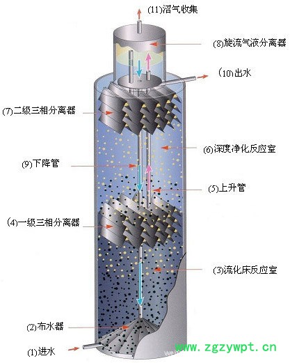 IC反应器构造的特点是具有很大的高径比,一般可达4-8,反应器的高度达到20m左右。整个反应器由**厌氧反应室和第二厌氧反应室叠加而成。每个厌氧反应室的顶部各设一个气、固、液三相分离器**级三相分离器主要分离沼气和水,第二级三相分离器主要分离污泥和水,进水和回流污泥在**厌氧反应室进行混合**反应室有很大的去除有机能力,进入第二厌氧反应室的废水可继续进行处理,去除废水中的剩余有机物,提高出水水质。