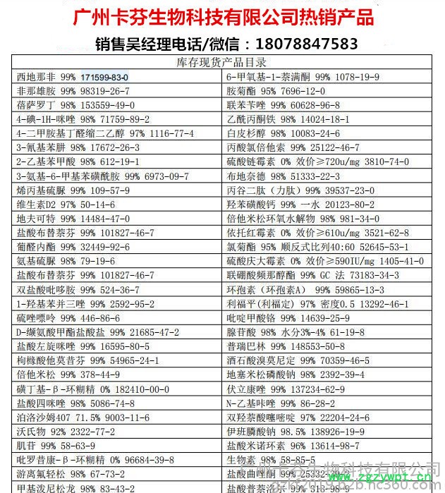 我司位于广东省广州市番禺区,主要经营医药兽药农药原料中间体、日化原料、精细化工、食品饲料添加剂、动植物提取物等几万种产品。我司在原料方面做了十几年,靠的是老客户的支持与自身品牌形象的树立与过硬的质量标准,所有在我司购买的产品下单前都必须签订合同,合同首条就是质量,一旦质量问题马上联系我司销售人员,我们一定给您合理的解决方案,质量是我们的基石!同价格的比质量,同质量的比价格!广东生产厂家现货供应 品质价格优势重磅出击 直面消费者