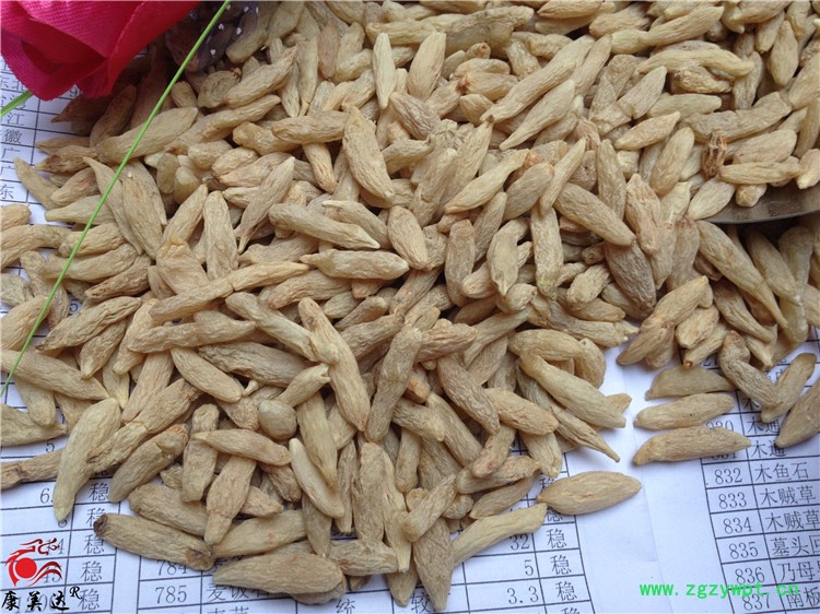 [性 状]:本品呈纺锤形,两端略尖,长1.5~3cm,直径0.3~0.6cm。表面黄白色或淡黄色,有细纵纹。质柔韧,断面黄白色,半透明,中柱细小。气微香,味甘、微苦。