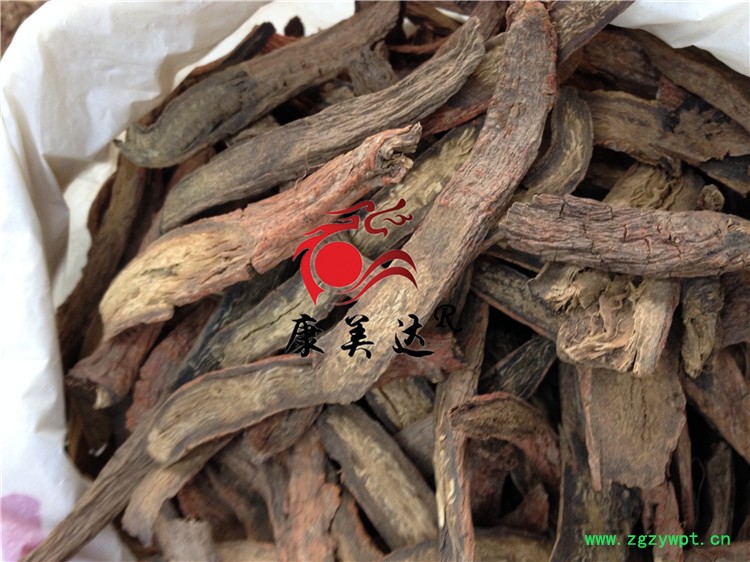 [性 状]:该药材丹参多为带根茎的根,根茎粗短,有茎基残余,下着生多数细长的根。根呈圆柱形,稍弯曲,表面呈砖红色,粗糙,具多数纵沟或皱纹,有须根痕,外部栓皮常鳞片状剥落,皮层有时开裂,长8~22cm,直径5~12mm,质坚脆,易折断,断面不平,疏松有裂隙,皮部棕渴色或砖红色,韧皮部狭。形成层明显,淡棕色,木质部导管束灰黄色或黄白色,放射状排列。气微,味微苦、涩,以条粗壮、色紫红者为佳。