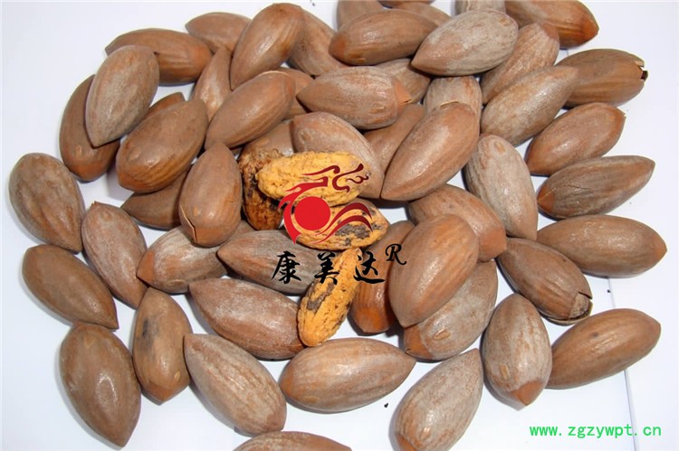性状:种子椭圆形或长卵圆形,长2-4cm,直径1.5-2.5cm。外表面黄棕色至深棕色,微具纵棱,一端钝圆,具一椭圆形种脐,色稍淡,较平滑,另端略尖。种皮坚而脆,破开后可见种仁1枚,卵圆形,外胚乳膜质,灰褐色,极皱缩,内胚乳肥大,黄白色,质坚实,富油性。气微,味微甜涩。炒熟后具香气。