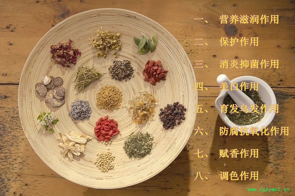 中草药往往兼具营养和疗效双重作用,且作用缓和,很适宜作化妆品中的添加剂,故国内外对添加中草药的化妆品研制很重视,被选用的中药已达百余种。目前,各种中药主要根据其理化特性被应用于各类化妆品中,其作用如下。