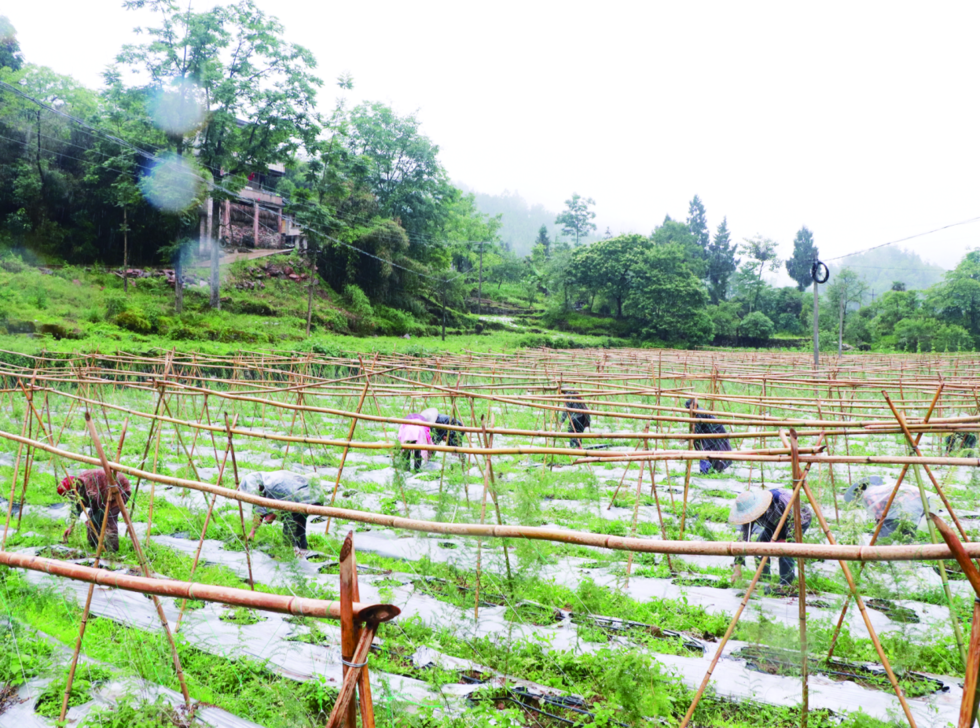 龙射镇永和村中药材基地,一眼望过去,一排排竹竿子整齐排列,天门冬、白芨都长势喜人,绿油油一片,有的已经开了花。工人们在基地不停地忙碌着,除草、牵藤……天空虽下着毛毛细雨,但是并没有影响工人们工作的热情,大家都干劲十足。