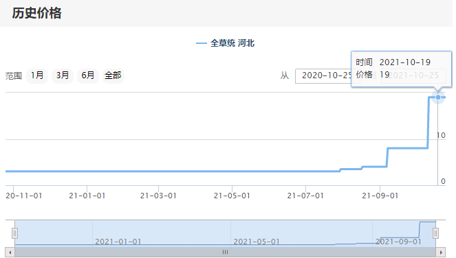 从行情上讲,墨旱莲已经连续多年低价,价格一直在3-4元之间小幅震荡,随着9月中旬产新序幕拉开,10月中旬价暂定在18元。在仅仅不足一个月的时间,墨旱莲从3元完美飙升至18元,目前市场要价20元左右。