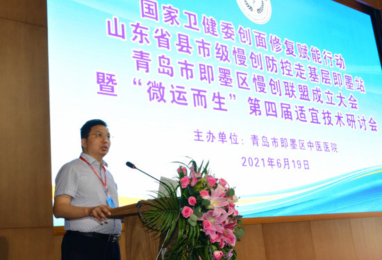 即墨区中医医院党委书记、院长赵成欣在青岛市即墨区慢创联盟成立大会暨“微运而生”第四届适宜技术研讨会上致辞