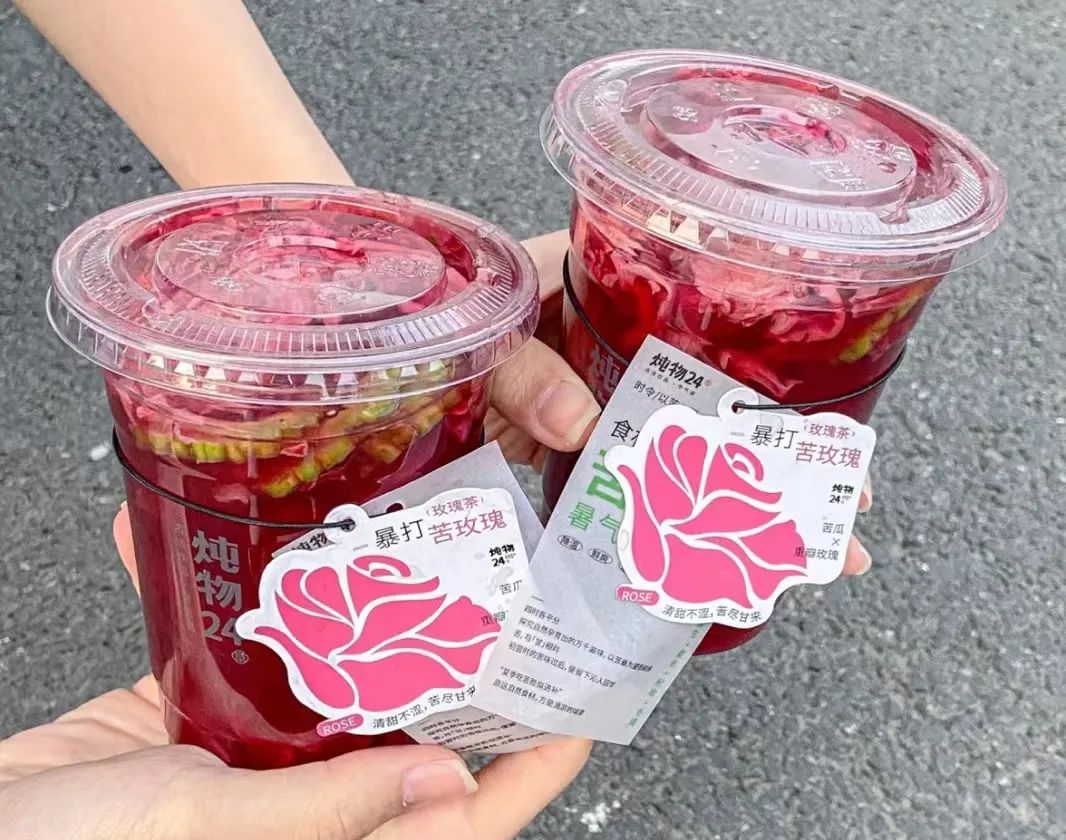 比如,炖物24章推出的暴打苦玫瑰,注入玫瑰花、洛神花熬制而成的素颜水,不仅清爽回甘,玫瑰红的色彩也让人眼前一亮。