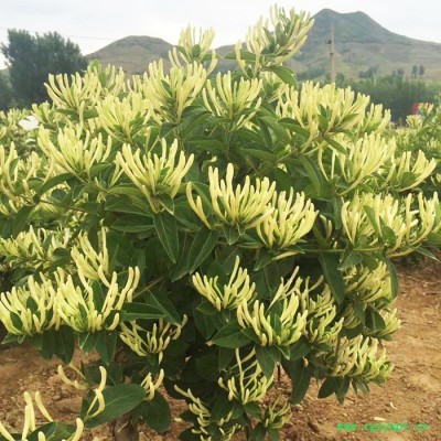 金银花属多年生半常绿缠绕及匍匐茎的灌木。小枝细长,中空,藤为褐色至赤褐色。卵形叶子对生,枝叶均密生柔毛和腺毛。夏季开花,苞片叶状,唇形花有淡香,外面有柔毛和腺毛,雄蕊和花柱均伸出花冠,花成对生于叶腋,花色初为白色,渐变为黄色,黄白相映,球形浆果,熟时黑色。