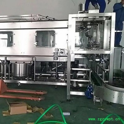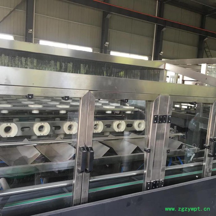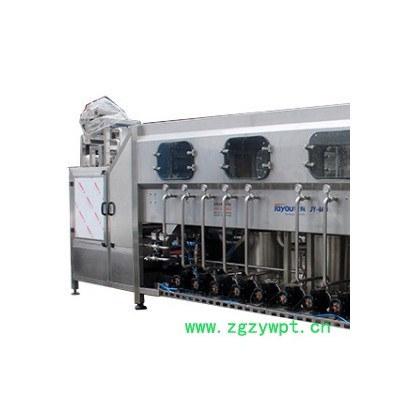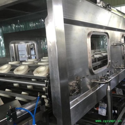 自动拔盖=>自动外刷=>上桶=>消毒冲洗=>灌装=>压盖=>输送=>套膜=>缩膜=>喷码=>自动套袋=>码垛