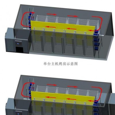烘房风道设计对烘干均匀性及烘干效率方面起着至关重要的作用,在烘房风道方面主要需要做到的尽量避免和减少热量和风量的死角,并且以简单经济的方式,通在烘道设计上一般采用穿流式和平流式。
