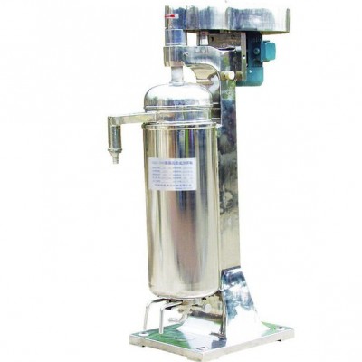 中药澄清型是管式分离机中的一种,它是我们公司专为中药制品行业设计的一种机型,中药管式分离机可以从根本上解决中药中含有皂、蛋白、多糖等成份难以分离或是在液体分离后仍有絮状物沉淀存在的问题,使药液完全回收,提高澄清效果。广泛适用于生物制药、植物提取及中药提取的分离 工作原理:该分离机为高速运转的沉降式分离机。由机身,传动装置,转鼓,集液盘进液轴承座组成,转鼓上部是挠性主轴,下部是阻尼浮动轴承,主轴由联接座缓冲器与被动轮联结,电动机通过传动带,张紧轮将动力传递给被动轮,从而使转鼓绕自身轴线高速旋转,形成强大的离心力场,物料由底部进液口进入,离心力迫使料液沿转鼓壁向**动,并依其密度差沿轴向形成两个同心液环。轻液由靠近轴心的轻液出口处排出机外,重液由靠近转鼓避的重液出口处排出,微量固体渣料沉积在转内壁上,停机后人工清除转鼓壁上的沉渣。