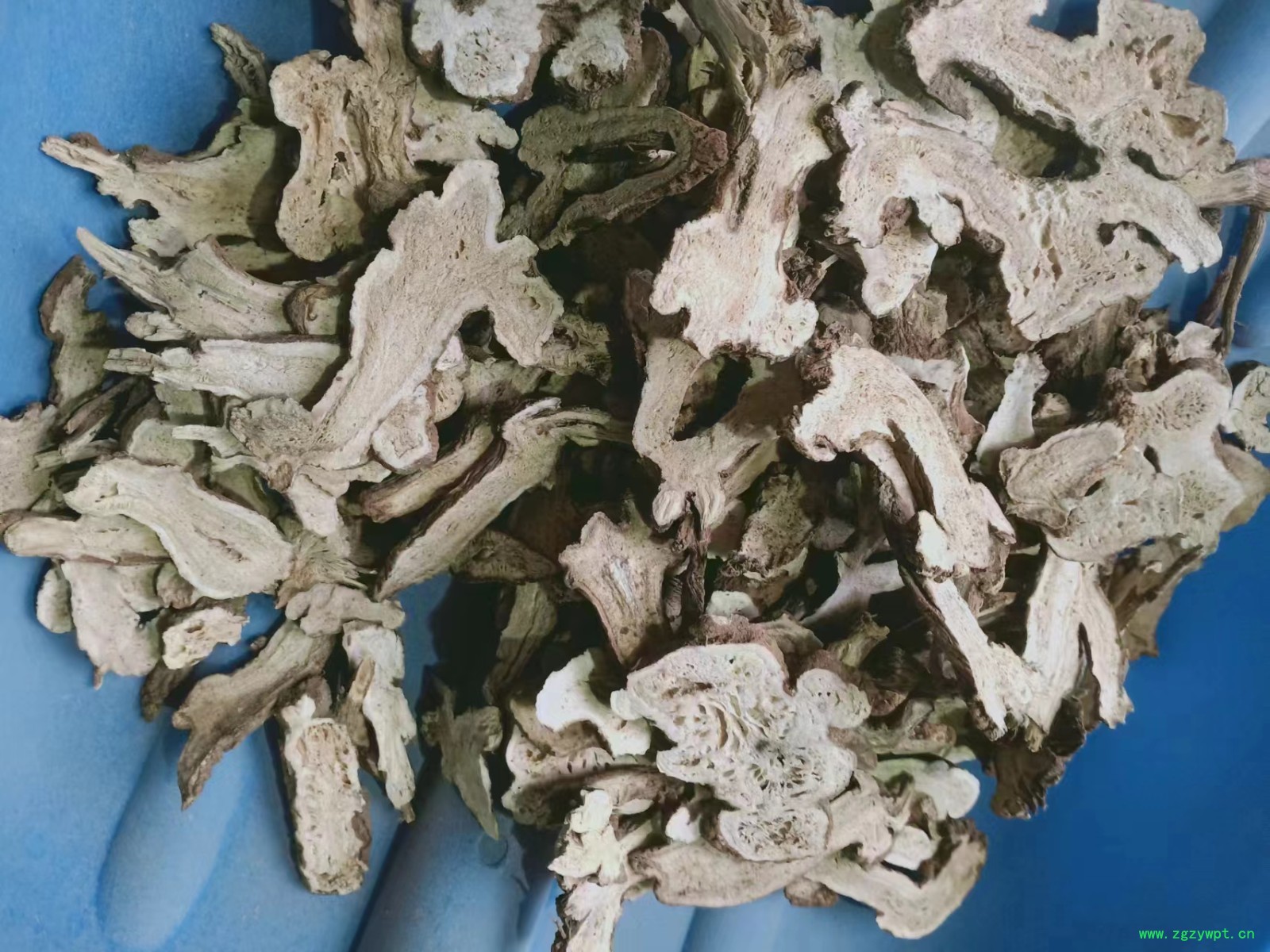 本品为不规则的肥厚团块,长3~13cm,直径1.5~7cm。表面灰黄色或灰棕色,有瘤状突起及断续的纵皱和