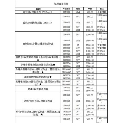 TRIzol法是RNA提取的传统方法,本试剂盒在传统方法上优化了裂解系统,适用于大多数样本的总RNA分离纯化,分离得到的RNA加入**离心后存在于水层中,可以有效避免DNA污染,本试剂盒样本处理量约为100mg左右鲜重组织或者20mg左右干重组织。