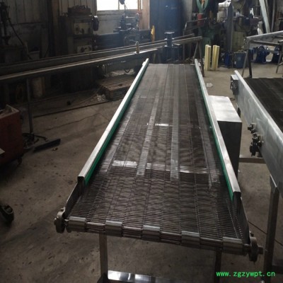 网带输送机多用于物料的多层输送晾干,采用不锈钢网带式作为载体,适用于各种食品操作行业的烘干、去湿、冷冻、热处理等步骤;网带输送机中的网带由不锈钢制成,网带本身具有耐高温、便于清洗等特点。网带输送机广泛应用于饮料瓶、铝罐、药品、化妆品、食品等行业的输送,通过选用不同的网带可以制作成储瓶台、提升机、杀菌机、蔬菜清洗机、冷瓶机以及肉食品输送等行业专用设备考虑网带承受拉力限制,单线长度一般不超过20米。结构形式有:水平直线输送、晋升爬坡输送、转弯输送等多种形式,输送带上还可增设晋升挡板、侧挡板等附件,能满足各种工艺要求。