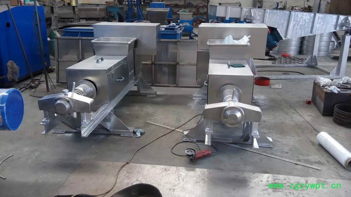 应用广泛,特别适合浆果的榨汁、各种光滑、流体物料的脱水,为了减少螺旋叶片的磨损和网孔的堵塞,螺旋外径和筛网要有**小的间隙,这样**把将要堵塞网孔的物料给刮走,所以该脱水机不易堵塞连续运行。相对于带式脱水机(易堵塞,需要大量的水清洗,造成二次污染;网带易坏),离心脱水机,板框式脱水机(易堵塞,需要使用高压泵;难以实现连续自动运行),该螺旋压榨机能自我清洗,不堵塞、无噪音和振动。所有与物料接触地方均为不锈钢材质。但每班停机后应及时清理筛网,以免造成物料干结堵塞滤网。